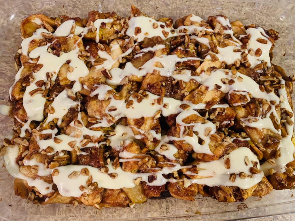 In a lightly greased 9×13 casserole dish, spread out half of the raw cinnamon roll quarters